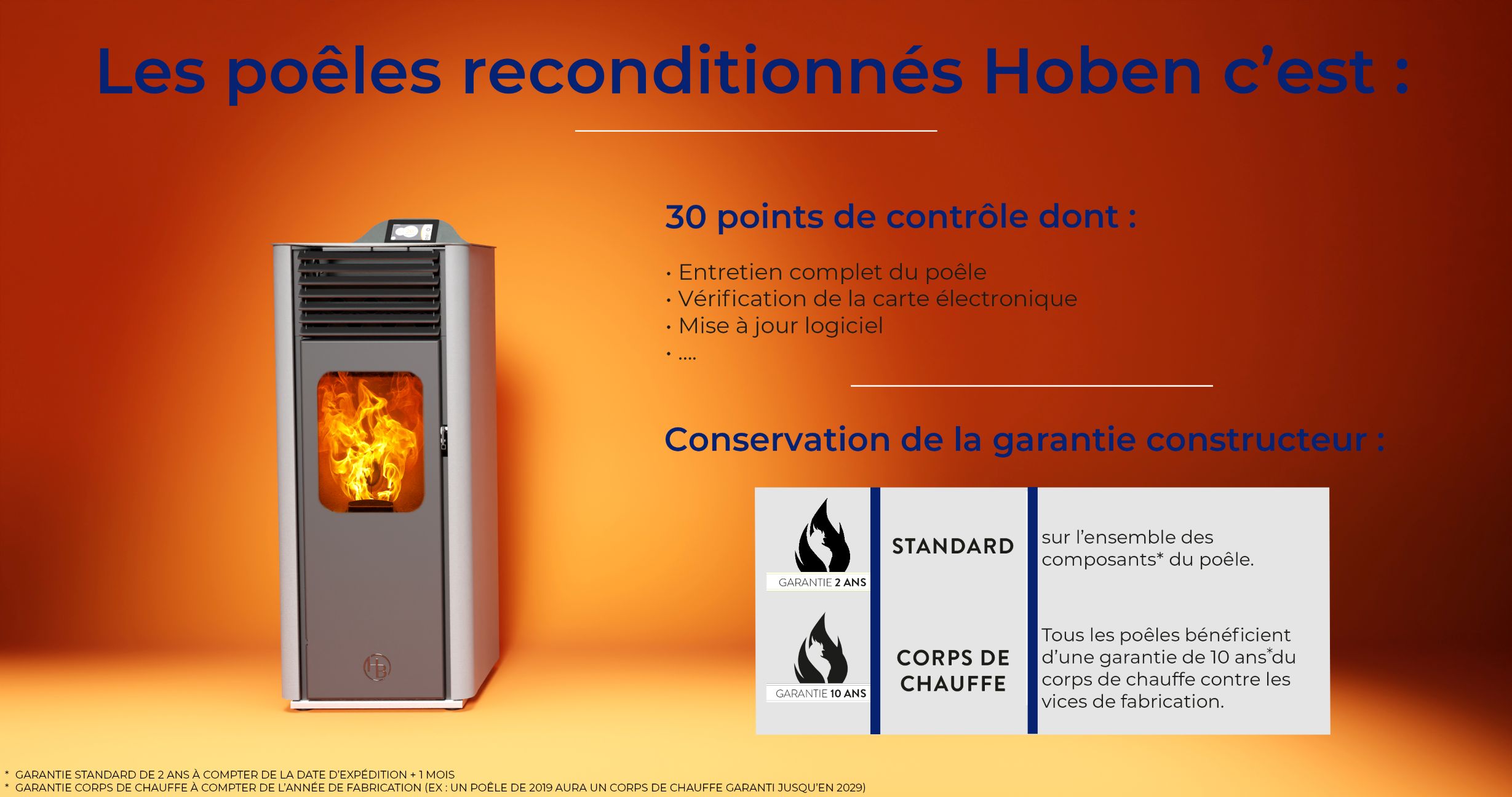 Tout comme nos poêles à granulés neufs, nos poêles à granulés reconditionnés bénéficient d’une garantie constructeur de 2 ans pour les pièces à partir de la date d’achat du poêle, les corps de chauffe sont garantis 10 ans à partir de la date de fabrication du poêle.